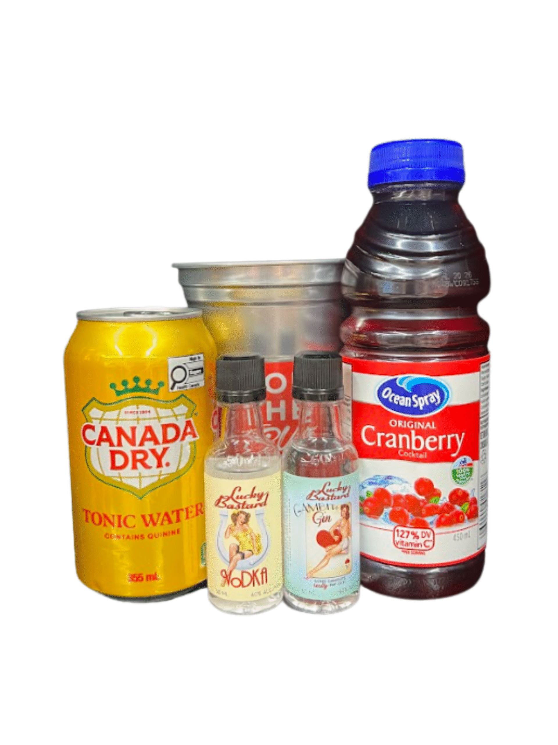 Includes 1 Tonic Water, 1 small Cranberry Juice, 1 Lucky Bastard Vodka 50ML, 1 Lucky Bastard Gin 50ML.