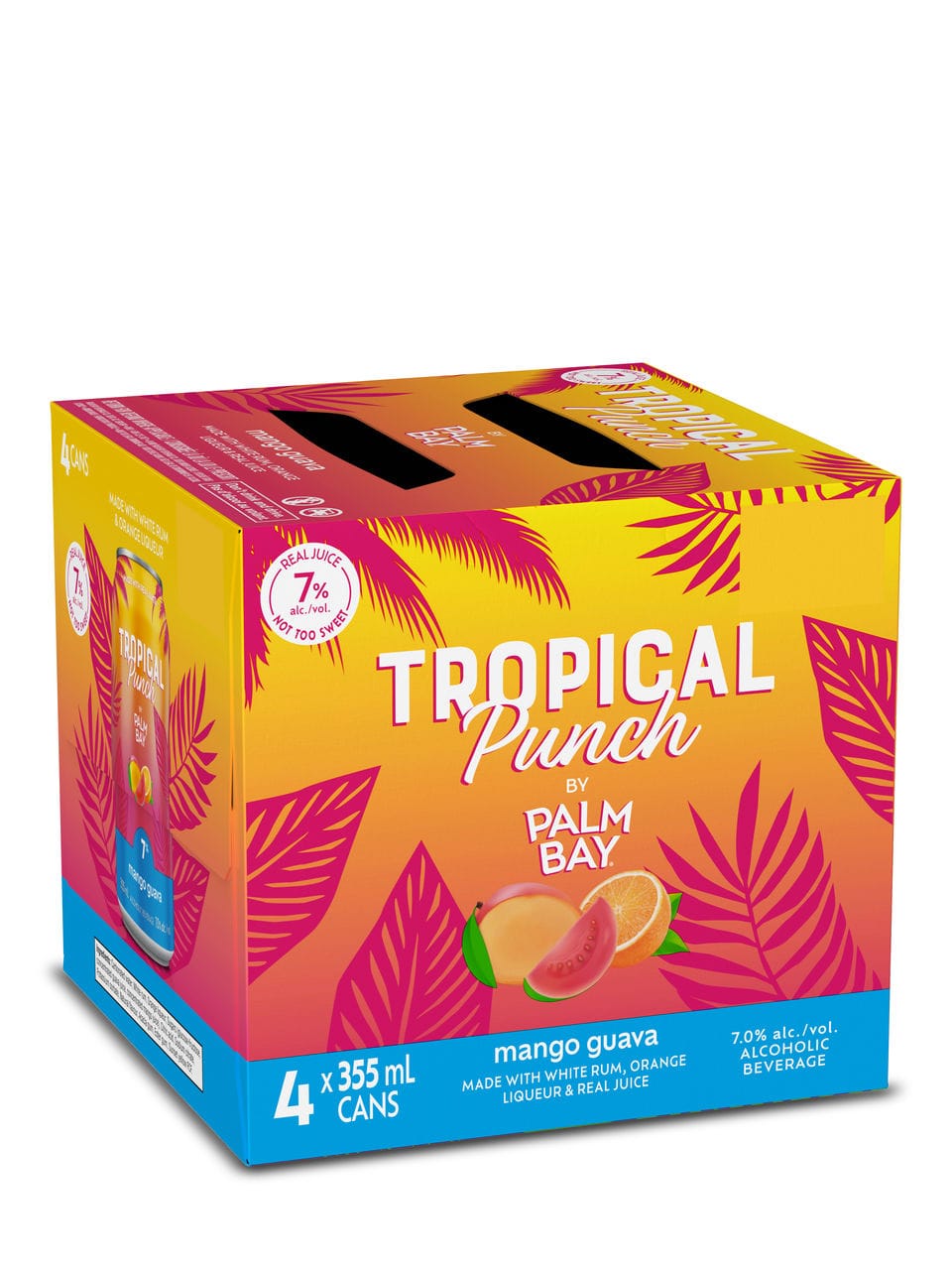 Palm Bay tropical rum punch is made with real juice, rum and orange liqueur. This convenient cocktail delivers a refreshing combination of mango and guava flavours, it has just the right amount of sweetness and 7% ABV. Serve chilled or over ice with a citrus garnish.