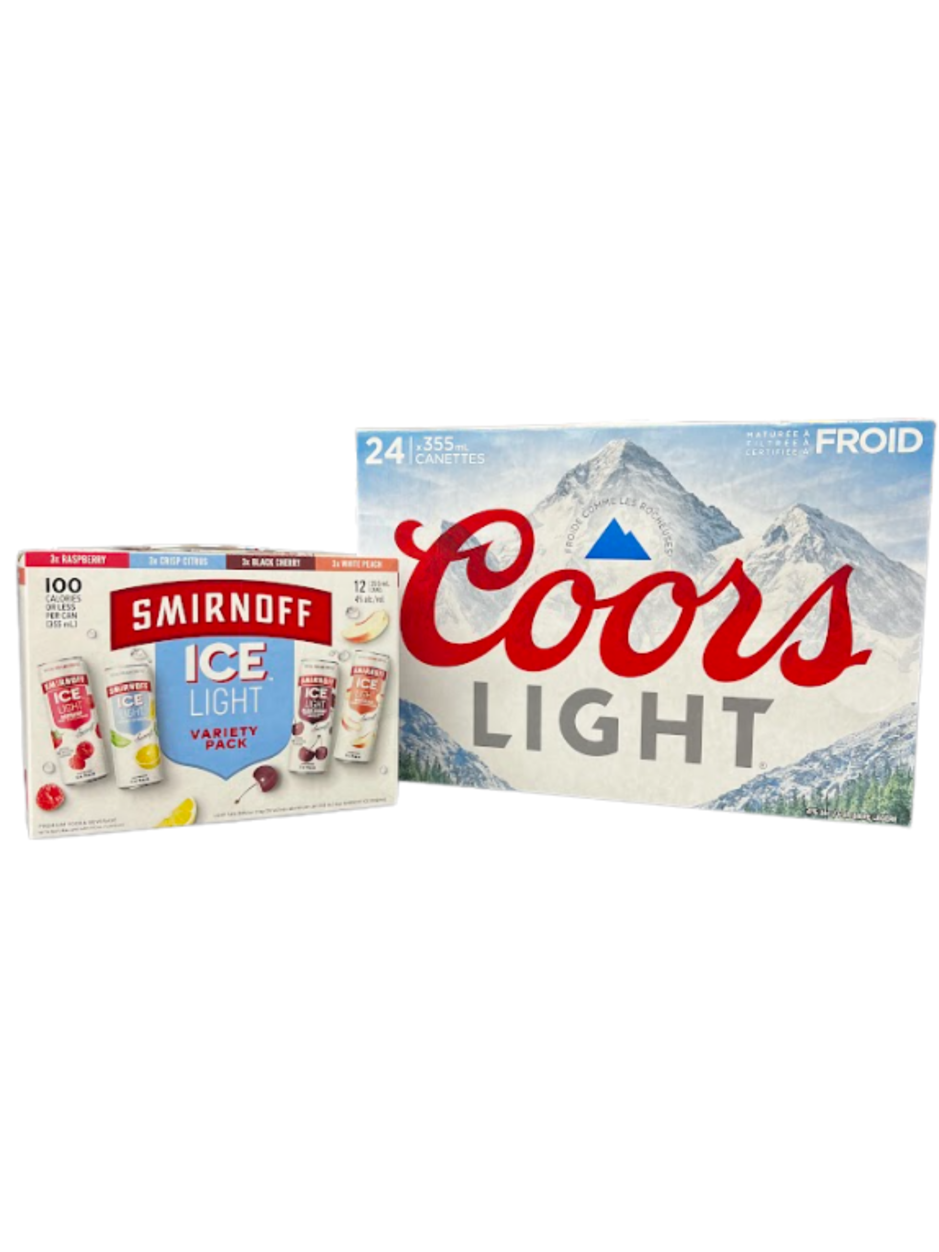 Includes Coors Light 24C, Smirnoff Ice Light Variety Pack 12C.