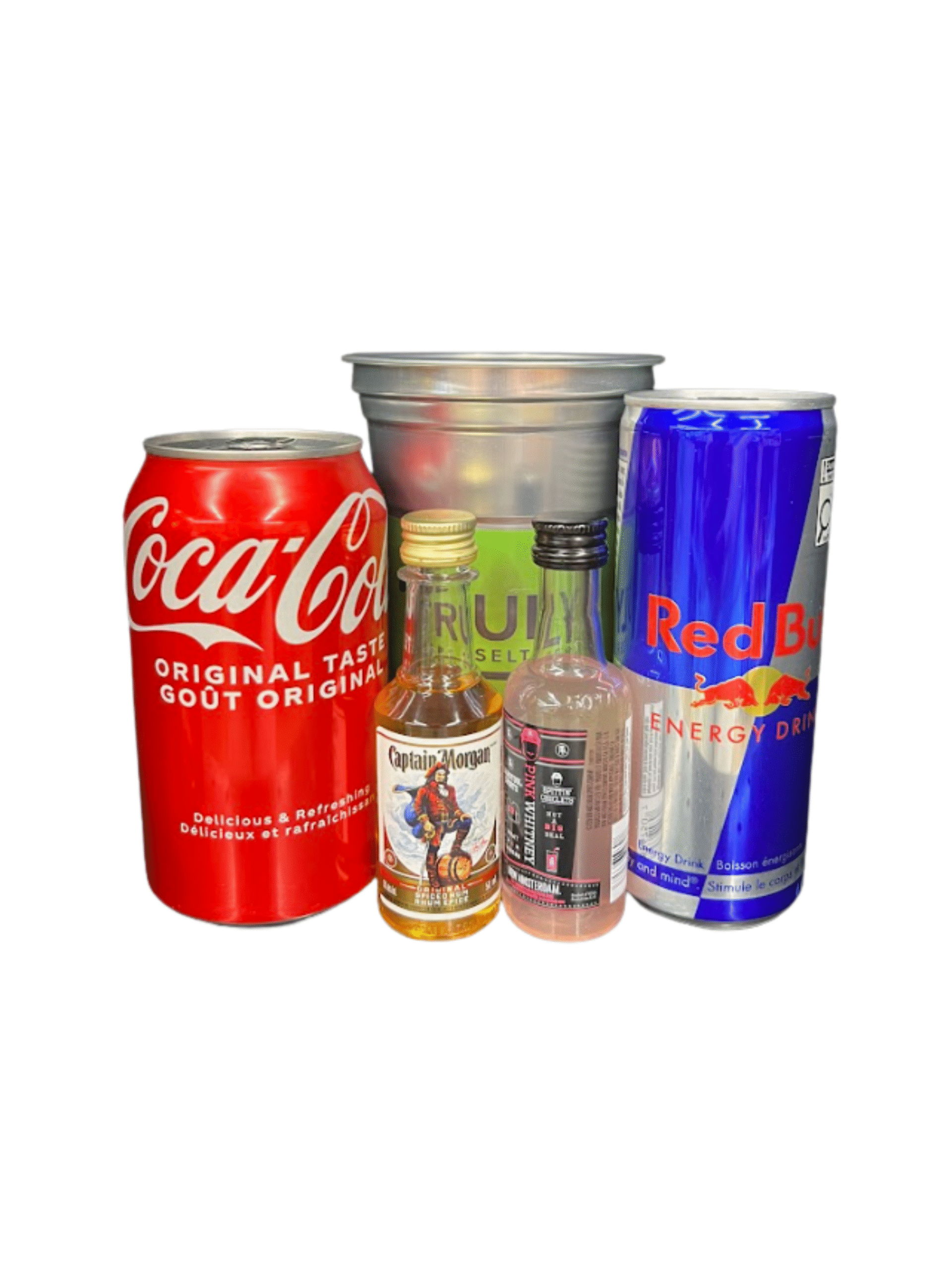 Includes 1C Coca-Cola, 1 Redbull 250ML, 1 Captain Morgan Spiced Rum 50ML, 1 Pink Whitney 50ML.