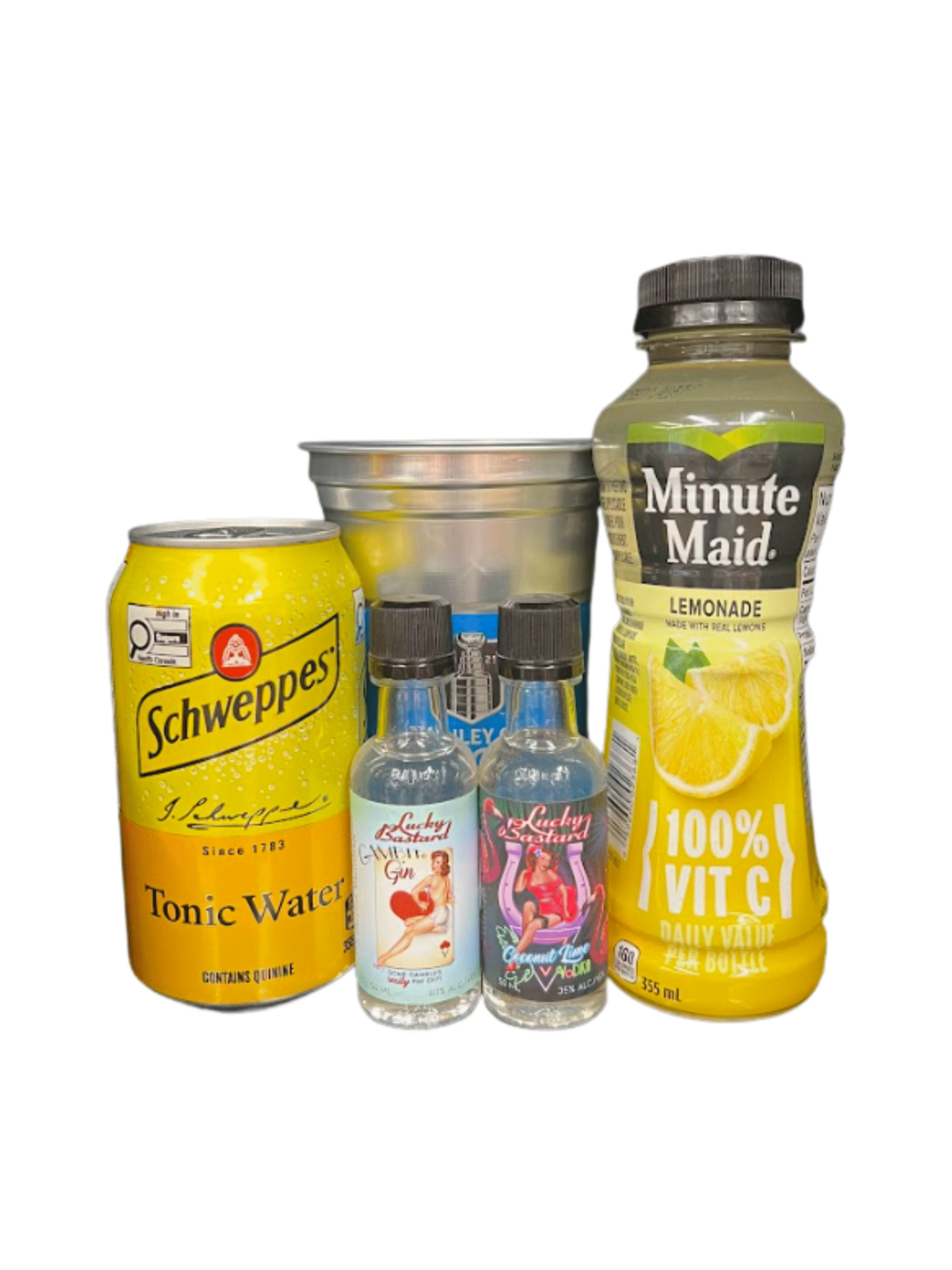 Includes 1C Tonic Water, 1 small lemonade, 1 Lucky Bastard Gin 50ML, 1 Lucky Bastard Coconut Lime 50ML.