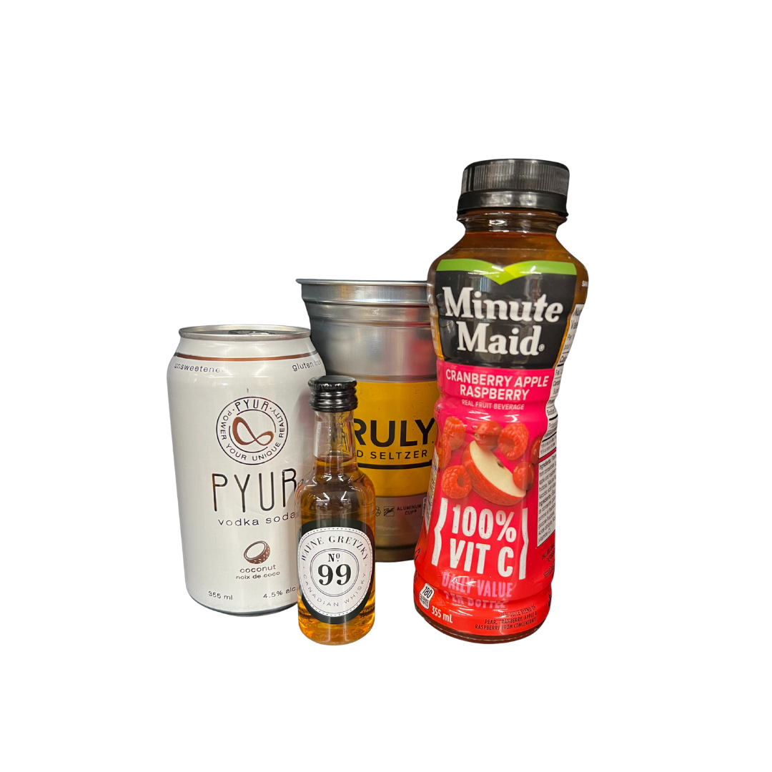 Includes: 1 can of PYUR Coconut Vodka Soda, 50 ml bottle of Wayne Gretzky No. 99, 355 ml of Raspberry Apple Cranberry Juice and Step-by-step instructions to bring the creation to life